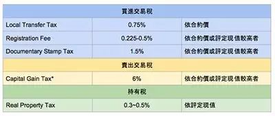 1.买进: Local Transfer Tax(换名税)0.75% Registration Fee(登记费)0.2-0.5% Documentary Stamp Tax(印花税)1.5%。