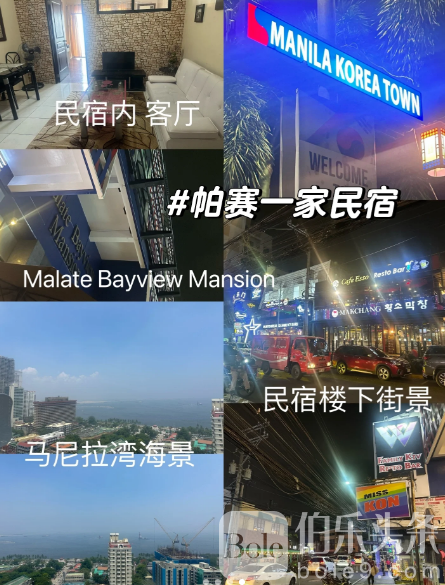 Pasay 的一个海景民宿(为了看马尼拉湾日落才定的这里,但是那天天气不好没看到):民宿所在的公寓楼是Malate Bayview Mansion,去了之后才发现这里是韩国城,周边很多韩国餐厅,也有红灯区,这栋楼比较老,民宿还算干净,但是有蟑螂、设施都不齐全,公寓楼周边挺破的,街道上有脏水沟很臭,步行去马尼拉湾baywalk只要5分钟,但是真不值得一去哈哈哈!300RMB一晚。