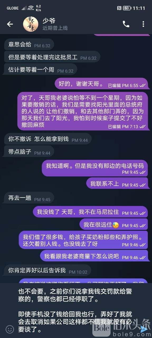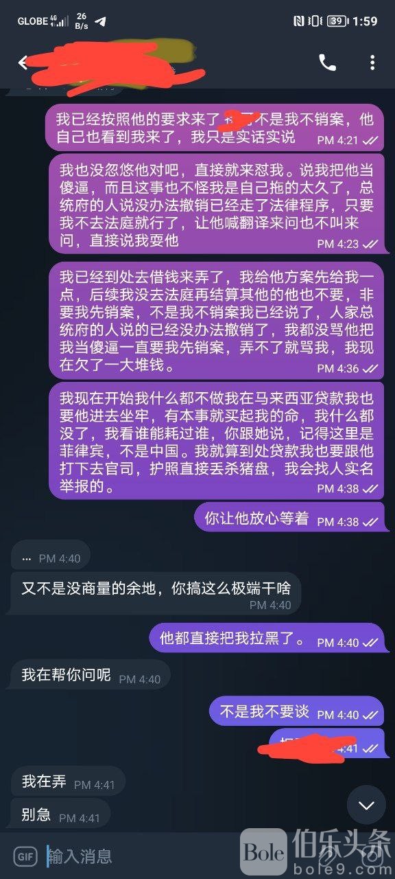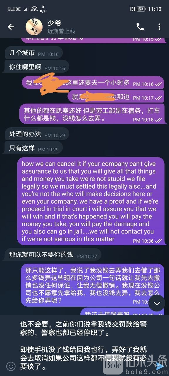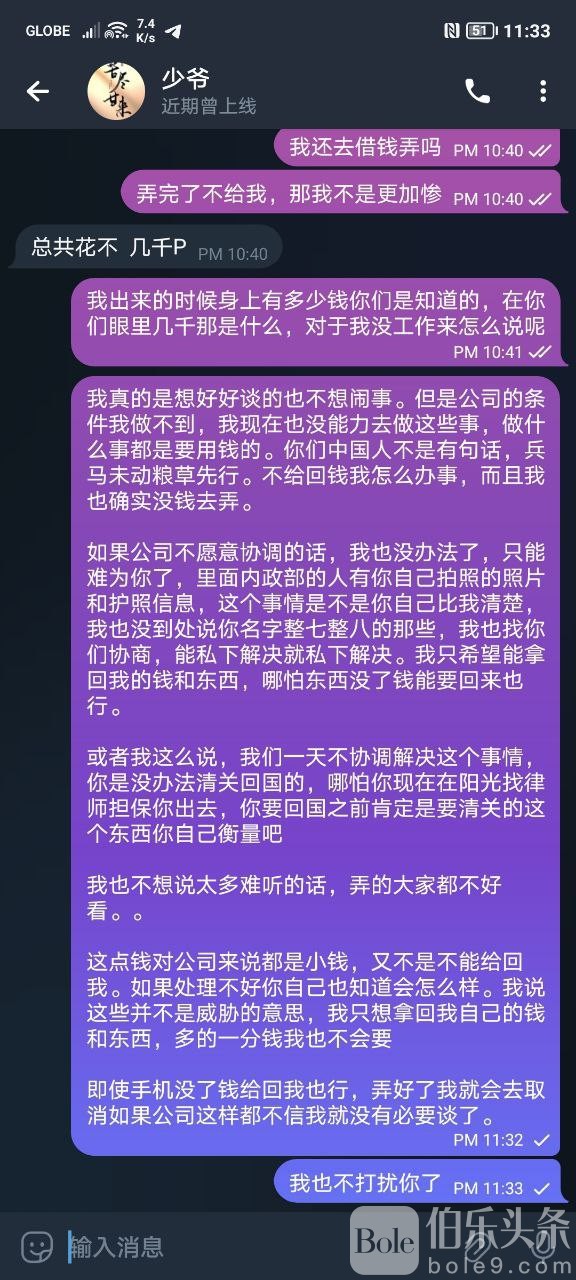 后来我只想拿回我的钱和东西,我就找到狗主管的联系方式并且想跟他好好谈,能拿回我的钱和手机,哪怕拿不完钱能拿一部分也行。但是这个狗主管让我先去销案完了才给我,然后在昨天十一月十六号我到达了阳光并且看到他。因为一些原因没办法撤销了,案件已经提交时间太长了。但是人家也说了只要我不上法庭,案件就会自然结束。但是他看我销案不到就威胁我,说别以为我怕你弄这个我就真的怕了,还口出狂言要找人跟我好好聊聊,要弄死我的意思,后来谈崩了他就把我飞机拉黑并且清除我的消息。