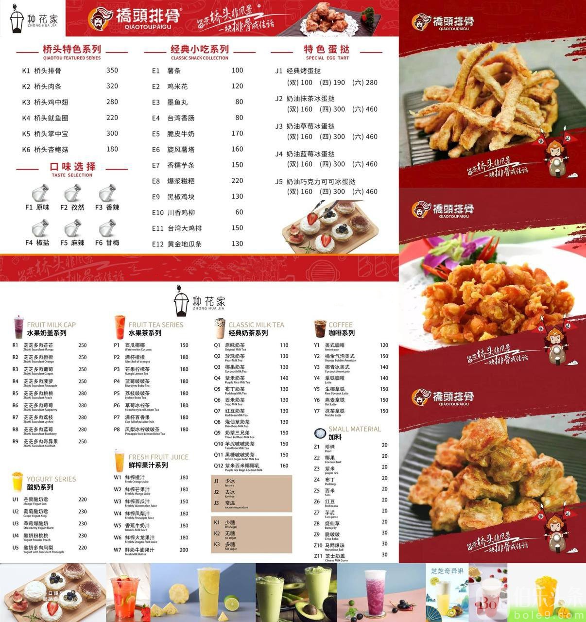 主营:桥头排骨/经典小吃/经典奶茶/水果茶/鲜榨果汁/果茶奶盖/酸奶果茶/咖啡等