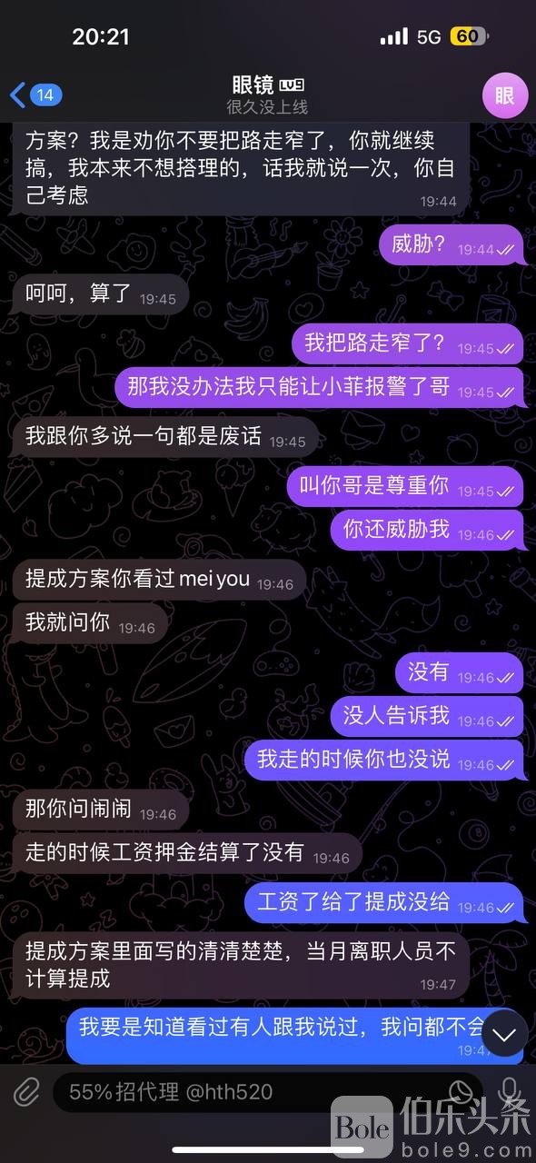 11月26号发提成,没有人通知。网友给主管发信息问10月份的提成,主管眼镜说离职员工没有提成,还反过来威胁网友。