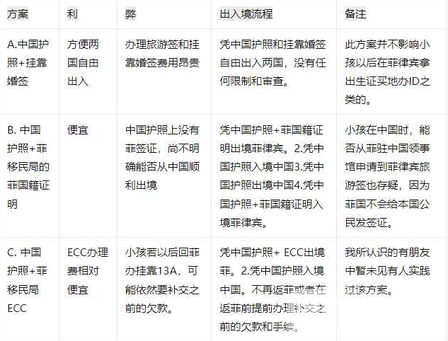 最后简单小结一下各种方案的利弊和出入境流程如下表: 总之,省钱的方案不省事,省事的方案不省钱。综合以上各种利弊考虑,以及未来可见的中国经济实力日益强大,在实际生活中,绝大部分父母都是直接选择方案A,也有小部分人先选择其他方案再迂回到方案A:例如先走方案D,到了中国后再放弃菲国籍和菲护照,去办理中国护照,办菲律宾旅游签再回到菲律宾,再 执行方案A,但这种方案的复杂和繁琐程度并不是一般人所能承受的,但算下来的所耗费的时间和精力,还不如直接上方案A。