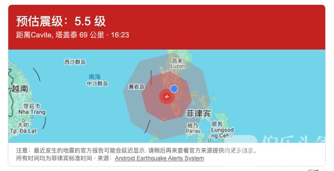 刚刚距离塔盖泰69公里的海域附近发生了5.5级地震!!