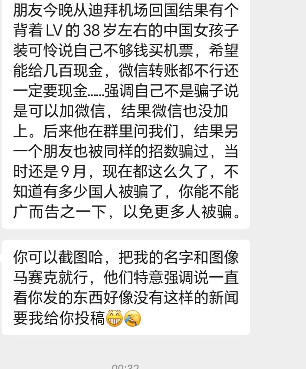 朋友今晚从迪拜机场回国结果有个背着LV的38岁左右的中国女孩子装可怜说自己不够钱买机票 希望能给几百现金 微信转账都不行还一定要现金……强调自己不是骗子说是可以加微信 结果微信也没加上