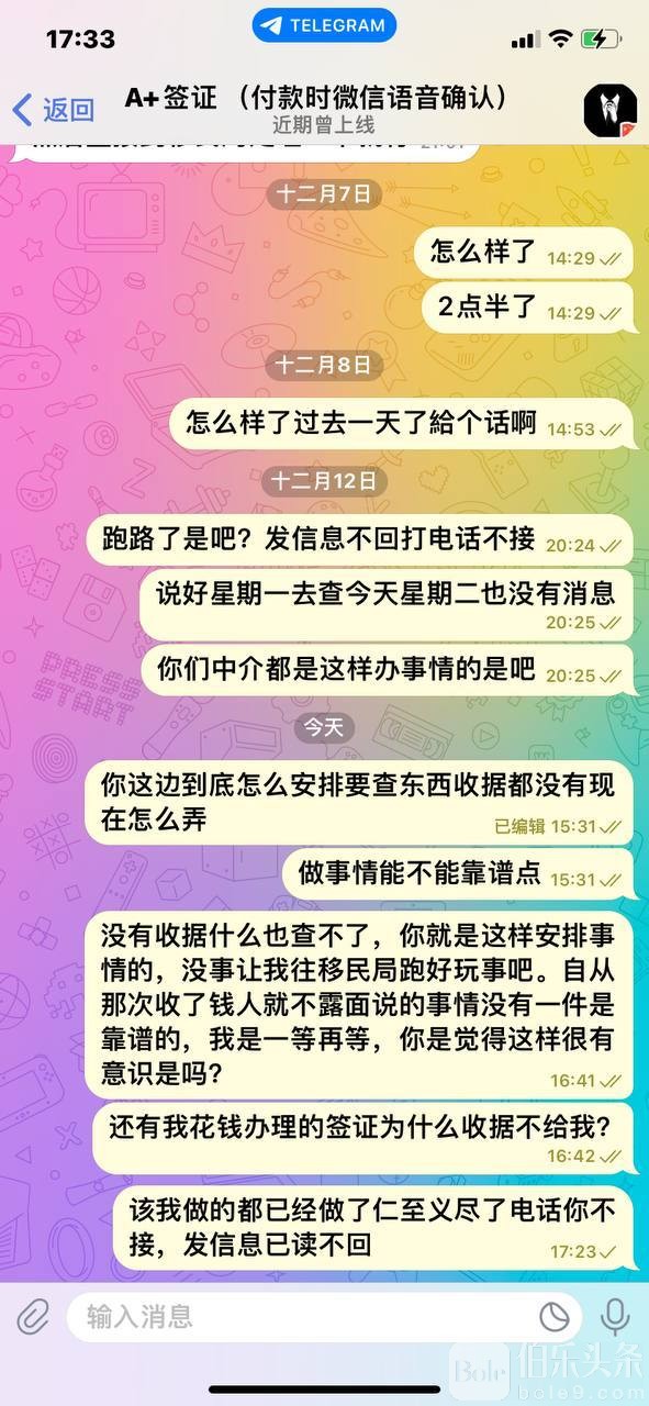 现在是发信息不回打电话不接今天还说安排他们中介公司的小菲跟我一起去移民局查现在签证的进度。结果去了才知道要有发票才可以查,到现在我也没有看到发票。实在是没有办法才选择曝光他,这个的国内信息我也知道了。