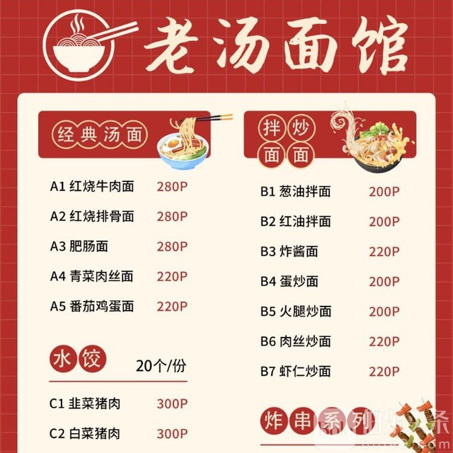本店主营:汤面 、炒面、拌面、水饺、炸串